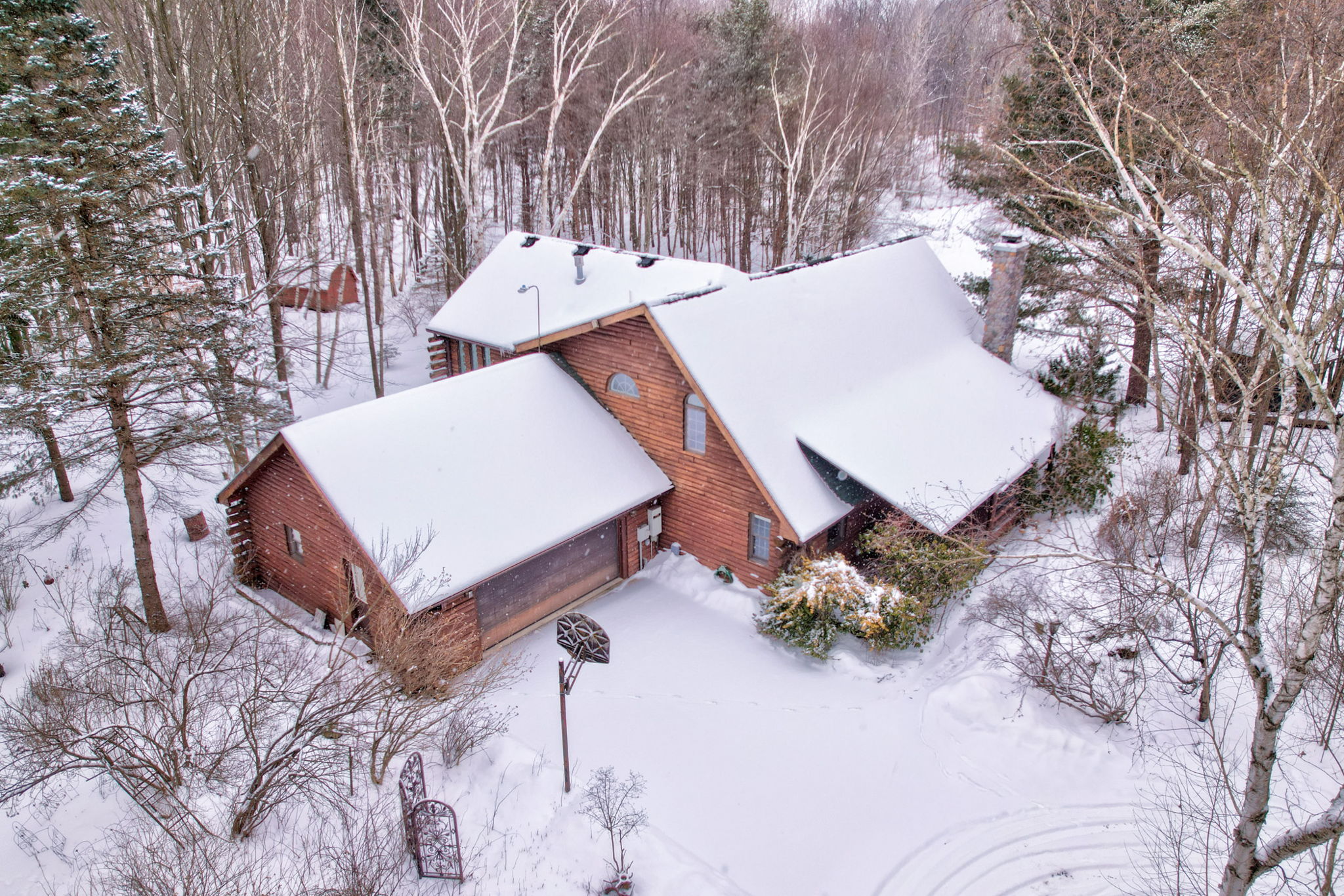 Welcome to your own private retreat situated on 5 acres of scenic land. This property features a 2,300 sq. ft. log home offering 4 bedrooms and 3 full bathrooms, along with a heated garage. The inviting living room includes a wood-burning fireplace for cozy winter evenings, complemented by three additional gas fireplaces throughout the home. Enjoy beautiful views overlooking the aerated, fully stocked pond.